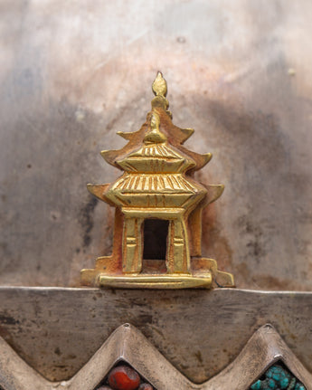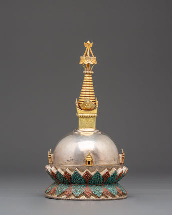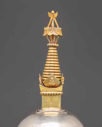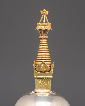 This Tibetan Buddhist stupa is a spiritual treasure, perfect for practitioners, collectors, and holy spaces. It is used in ceremonial ceremonies, as an altar centerpiece, or as a symbolic container for relics and blessings, and represents harmony, protection, and spiritual energy. This silver and gold-plated stupa combines artistry with deep spiritual meaning, making it a lasting piece of Buddhist heritage that inspires devotion and inner serenity.