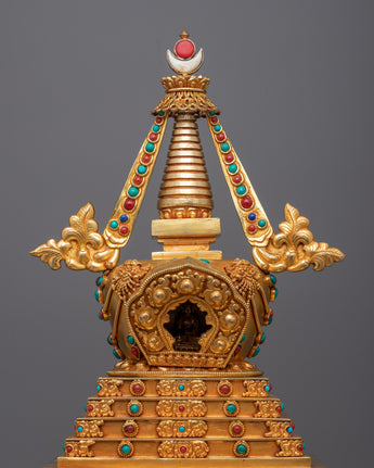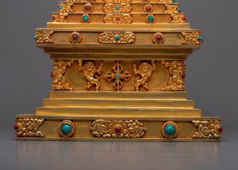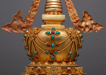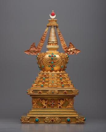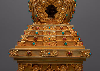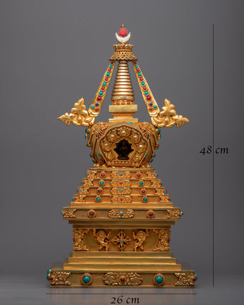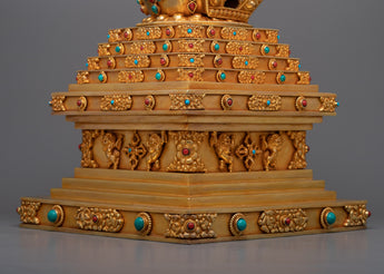 This Buddhist Stupa Statue is ideal for use in meditation rooms, spiritual centers, or as a stunning addition to a religious art collection. Its significant size and weight make it a prominent and impactful piece, while the combination of Copper and gemstones creates a blend of traditional craftsmanship and ornate beauty, suitable for anyone seeking a meaningful and authentic representation of Buddhist spirituality.