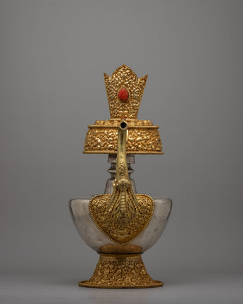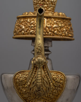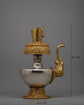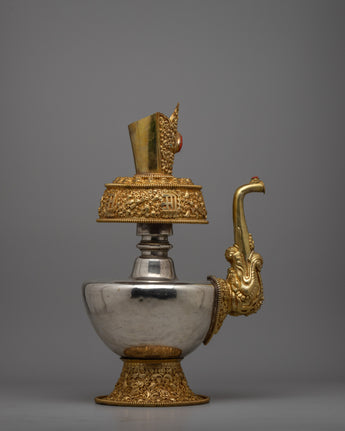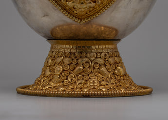 The Bhumba, which has long been a part of Buddhist rites, represents the sacrifice of cleanliness and water to the gods and is essential to enlightenment and spiritual awakening ceremonies. Its brilliant silver body symbolizes mental clarity and purity, while the gold and copper accents highlight its kind and wise attributes. Its beauty is further enhanced by the fine decorations and wonderful engravings, which reflect the rich cultural legacy and profound spiritual importance of Tibetan Buddhism. Whether utilized for prayer, meditation, or ritual offerings, this Bhumba set is an effective spiritual instrument.
