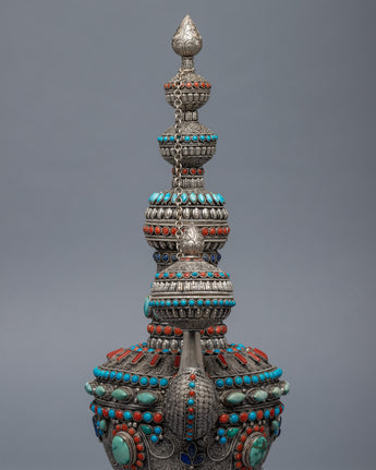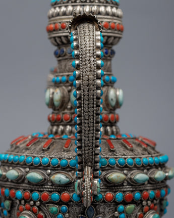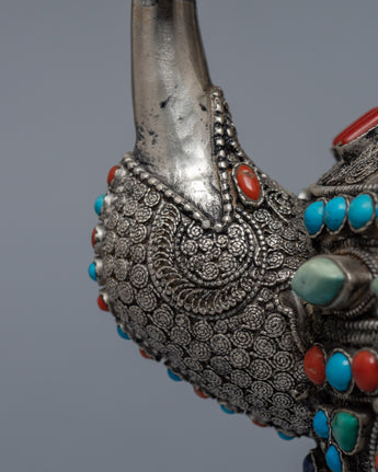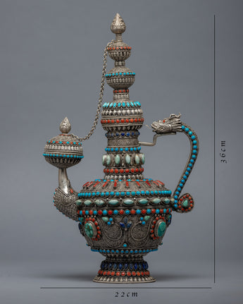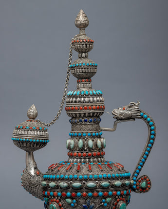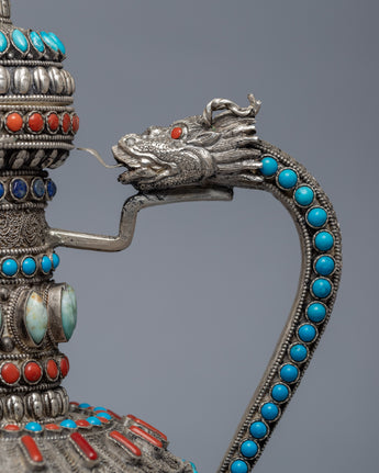 The carved teapot is traditionally made with copper and plated with silver. The gemstones are inlaid on the teapot. It is a unique Tibetan teapot with a dragon on the holder grip, where the dragon traditionally represents fortune, authority, growth, luck, and development.