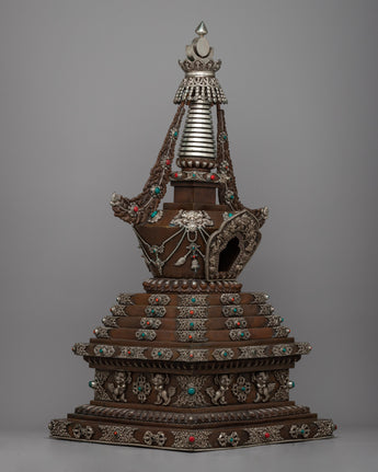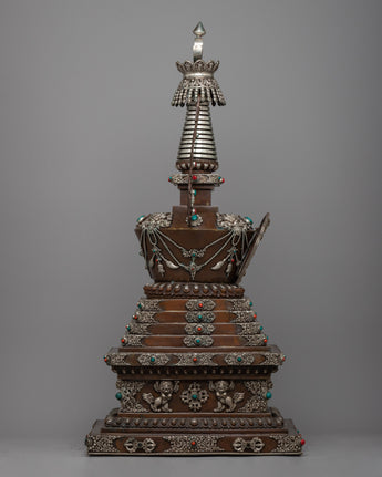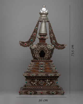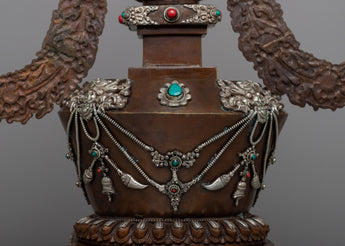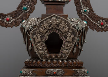 This shrine stupa is meticulously crafted from Copper and has a delicate silver plating, giving it a sense of respect and spirituality. Its substantial 36-cm width guarantees that it attracts notice and respect, acting as a center for reflection, prayer, and meditation.