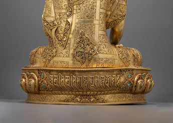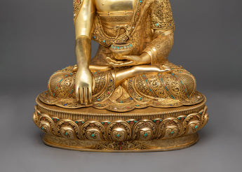 The Shakyamuni Buddha, Spiritual Master statue is a hand-crafted statue that was meticulously made in Patan, Nepal, a city known for Buddhist workmanship. This statue, made of a copper body and gilded in 24K gold, is adorned with gold and acrylic paints. This sculpture, standing at 22.0"/56cm in height and 15.9"/40.5cm at the base and weighing 13.89 kg, is a monument for meditation spaces, shrines, or altars, which inspires a deeper connection to the path of enlightenment and inner harmony.
