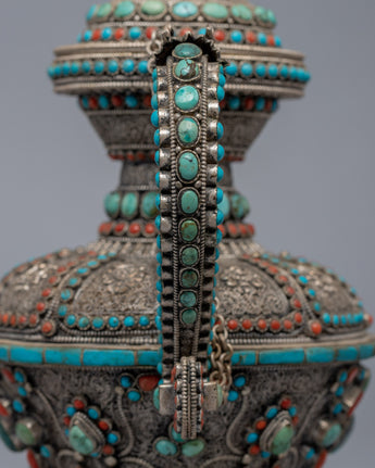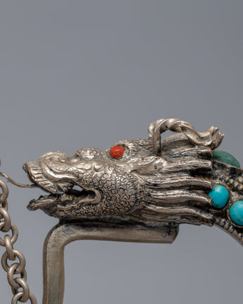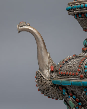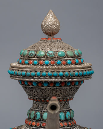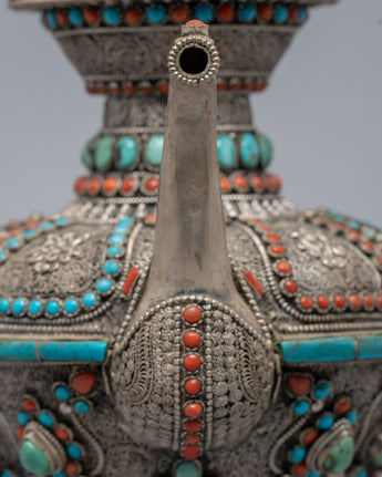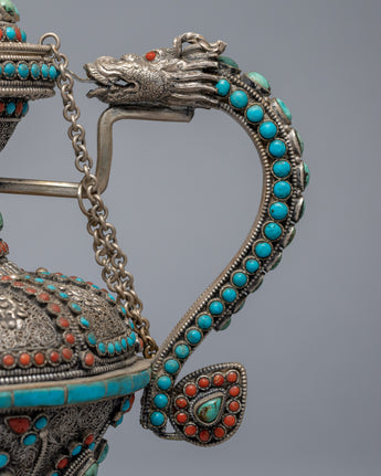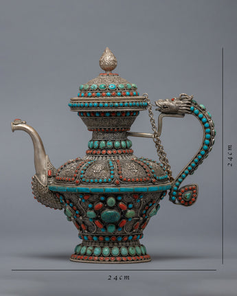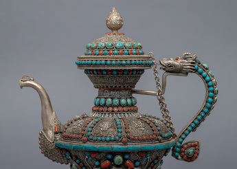 The carved teapot is traditionally copper and silver plated with embedded Tibetan stones. It is a unique Tibetan teapot with a dragon on the holder grip, where the dragon traditionally represents fortune, authority, growth, luck, and development.