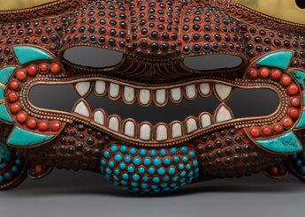 The intricate Filigree Art woven into the surface of the mask is a wonder to behold. Its delicate patterns, meticulously created by skilled artisans, produce a captivating interplay of light and shadow. The repressed art technique gives fierce expression depth and dimension, inspiring awe and respect.