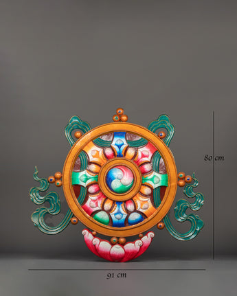 This handcrafted Dharma Wheel wall hanging, made of high-quality copper and painted with brilliant acrylics, is an exquisite depiction of one of Buddhism's most important symbols. This intricately constructed wall art stands 80cm tall, 91cm at the base, and weighs 13.46 kg. It represents the path to wisdom, spiritual progress, and enlightenment. The Dharma Wheel (Dharmachakra) is a key Buddhist emblem representing the Buddha's teachings and the Eightfold Path to Nirvana.