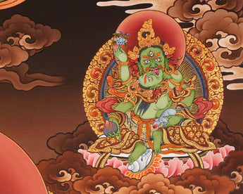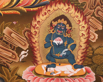 Beyond the pursuit of material wealth, Dzambala's presence through thangka paintings and symbolism conveys deeper spiritual meanings, emphasizing the importance of selflessness and compassion. Devotees aspire not only to acquire wealth but also to utilize it for the benefit of others and the attainment of enlightenment. Thangka paintings of Dzambala, with their intricate details and rich symbolism, serve as visual aids for meditation and prayer, guiding practitioners on their spiritual journey towards prosperity and enlightenment.