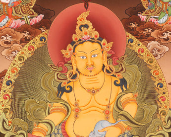 Depicted seated on a lotus throne in the thangka painting, Dzambala holds a mongoose in one hand and a jewel-spouting mongoose in the other. The mongoose symbolizes the ability to transform poverty into abundance, while the jewels represent spiritual wealth and enlightenment. Devotees recite Dzambala's mantra to invoke his blessings for prosperity, and rituals dedicated to him involve offerings of incense, flowers, and symbolic items to attract his favor.