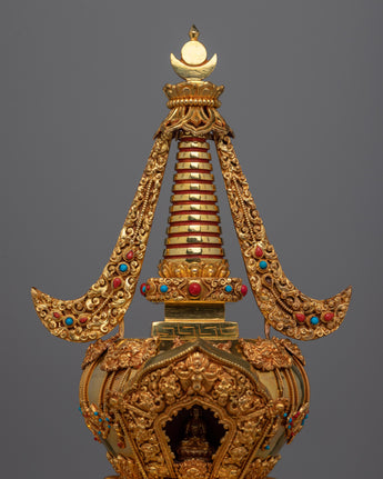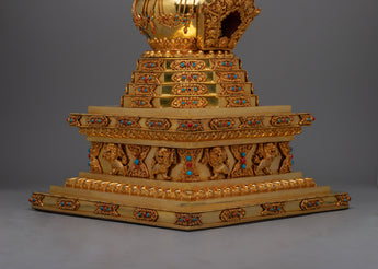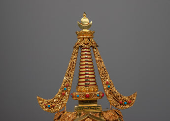 The Traditional Buddhist Gold-Plated Stupa is perfect for collectors, art supporters, and spiritual practitioners because it is a beautiful decorative item and a potent sign of spiritual devotion. This stupa inspires reflection and dedication whether it is positioned in a meditation area, on a holy shrine, or as a beautiful accent in any setting. Its artistic beauty and spiritual symbolism enhance any surroundings and is a treasured addition to any collection or sacred space. The stupa's overall aesthetic appeal is enhanced, and it becomes a focal point of admiration with the addition of a touch of elegance and devotion provided by the Gold Plating .