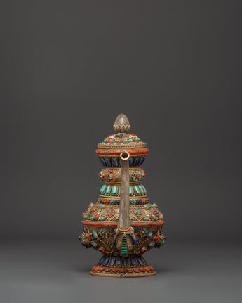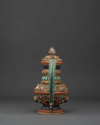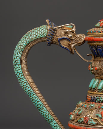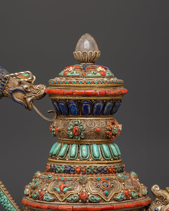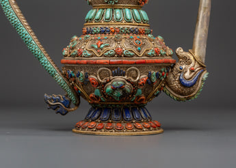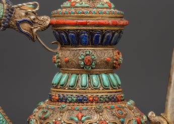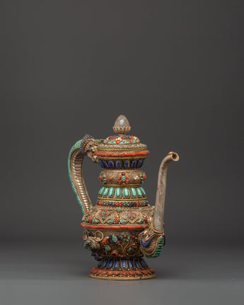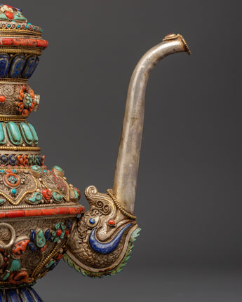 The teapot's body is embellished with delicate silver filigree work and elaborate embossing, which showcases flower designs and sacred Buddhist imagery. Embedded stones are placed in vivid patterns to symbolize harmony, vigor, and protection. The conch shell pattern is a treasured emblem of the Dharma's far-reaching voice, while lapis lazuli represents knowledge, turquoise healing, and coral life force. These components combine to make a potent spiritual item that may be used for rituals or as an appealing spiritual decorative piece.