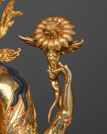 The statue is embellished with a hand-carved gemstone, which adds to its holy beauty and depth. The gold plating emphasizes Chenrezig's celestial attributes, making it an effective complement to any Buddhist altar or spiritual area. This statue's artistry and intricacy elevate it beyond mere decoration to become a powerful symbol of caring energy and spiritual satisfaction.