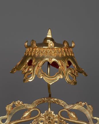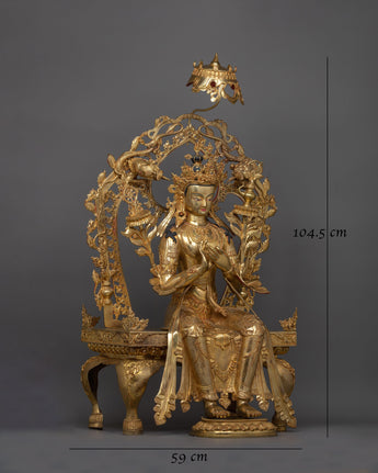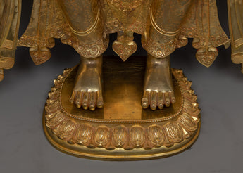 The 104.5 cm tall Buddha Future Enlighten One Statue is a remarkable work of art, skillfully fashioned from finest copper and embellished with 24K gold gilding. This monument symbolizes Maitreya's function as the hope and enlightenment-bringing figure of the future by capturing his calm and caring presence. The deity's kind attributes are emphasized by the intricate carvings and brilliant gold finish, which make it a stunning addition to any area looking to instill calm and good vibes.