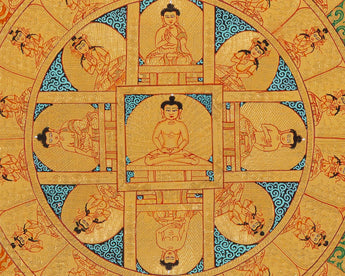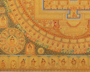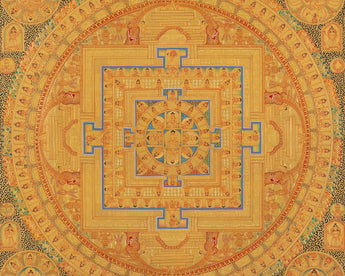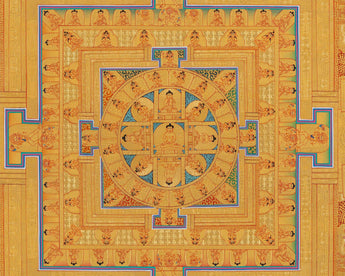 Mandala literally means a circle . The tibetan word for madala is Kyilkhor , which means “centre and surrounding environment .” In simple terms it is a circle used as a visual aid for concentration and introversive meditation . Meditating using a mandala leads to the attainment of insights and it helps to increase one’s level of concentration . It also helps to activate forces within oneself which culminates into “Siddhi ” or super – natural forces . The mandala is the graphic representation of this process . It is not only theoretical but practical as an operational scheme involving a clear plan for practical realization of the process within oneself . It thus becomes an instrument ( Yantra ) . It is believed that by just looking at a mandala one’s soul is spiritually purified. Thus , a mandala represents the palace of purity a magic circle cleansed of spiritual obstacles and impurities . The square of the sacred palace is enclosed in multiple circles of flame, vajra and lotus . These three circles forming the outer rims of the mandala symbolizes enlightenment , which the meditating person must gain , before he or she can enter the illuminated palace . The mandala then consists of the inner square where the deity of the mandala resides .