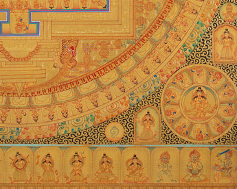 This Thangka is used as an instructional tool and auspicious talisman. The stylized astrological chart brings good fortune to all those who possess it ,see or display it. The painting is a collection of astrological, calendar and primary element symbols.