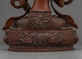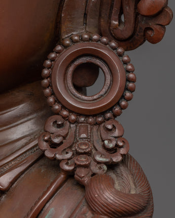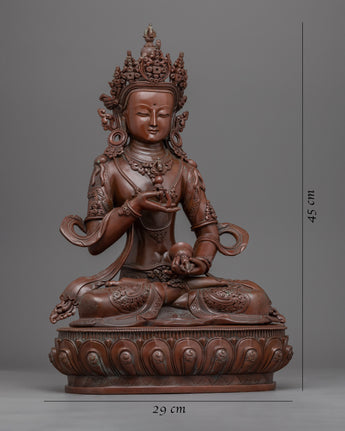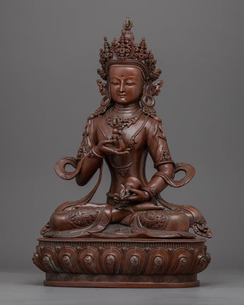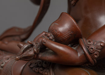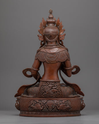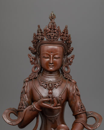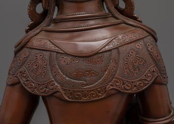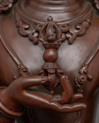The Mantra of Vajrasattva Practice Statue is a lovely work of art that has been created on an oxidized copper body. The deity is seen sitting in a meditative pose on a lotus foundation. Vajrasattva, the bodhisattva of purification, is holding a vajra in his right hand and a bell in his left. The statue is meticulously designed, down to the folds of the robe and the deity's facial expression. This statue is ideal for individuals who practice the Vajrasattva mantra, which is thought to purify the mind and eradicate negative karma.
