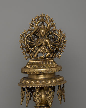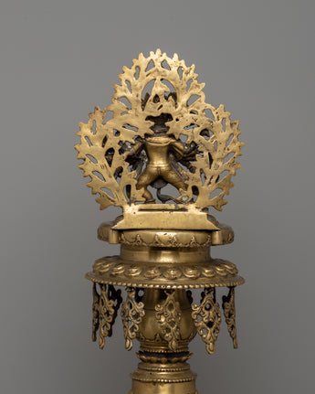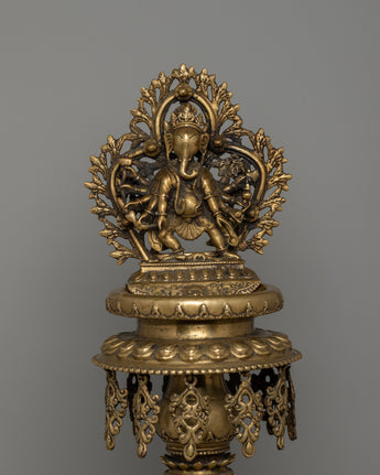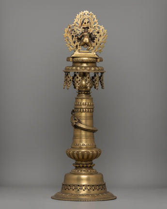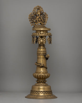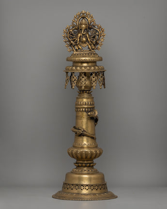 Two deities sit atop each oil lamp, adding spiritual significance. On the right side, Ganesh, the remover of obstacles, is masterfully crafted and exudes peace and grace. Another deity brother of ganesh is represented on the left side, brandishing a sword, indicating the ability to cut through ignorance and delusions. The two deities are surrounded by ornate crowns and exquisite vegetation, representing their elevated spiritual status. This lamp set, weighing 14.180 kg and constructed of high-quality brass, combines gorgeous craftsmanship with profound significance, making it a great focal point for holy places or any room that requires spiritual illumination.
