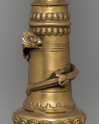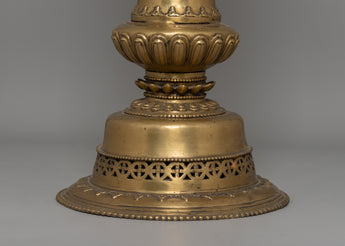 This remarkable oil lamp set, made of brass, has exquisite embellishments that make it both ornamental and spiritually appealing. Each lamp's base features elegantly carved flower designs representing the relationship between the holy and nature. Each pillar's base is wrapped in a dragon, a potent emblem of protection and strength. Above this, leaf-like carvings are crafted in an upside-down orientation, adding a dynamic visual aspect. Under these intricate patterns, a single-petal lotus is carved, indicating purity and spiritual growth, with lotus flower motifs adding to the lamps' holy presence.