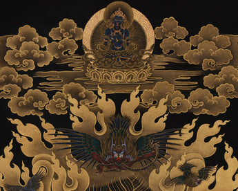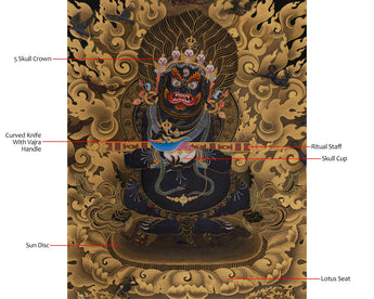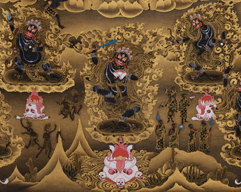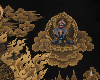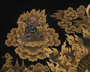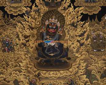 Shakyapa Mahakala, the wrathful protector deity of the Sakya lineage in Tibetan Buddhism symbolizes intense compassion and unwavering commitment to defending the Dharma. This impressive thangka, measuring 30" x 40" inches, is hand-painted on black canvas and embellished with real 24K gold. It is a powerful and significant piece of sacred art, rendered in the traditional Nakthang style, which embodies Shakyapa Mahakala's fierce wrath and divine authority.