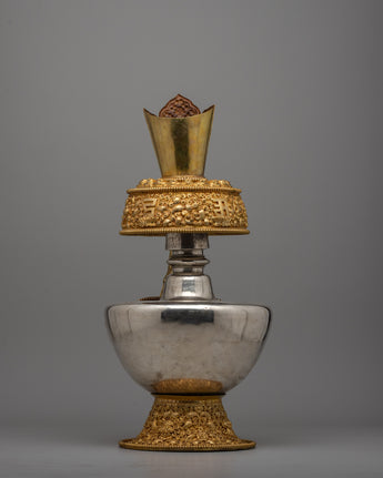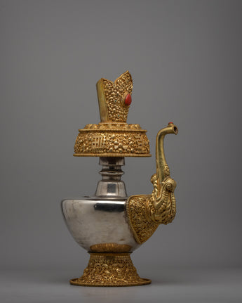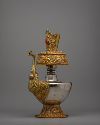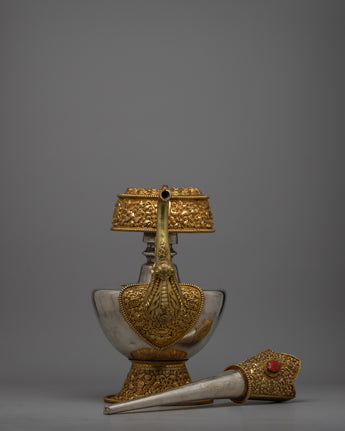 This Buddhist ritual object, known as a Bhumba Set, is made of copper body and Pure Silver which is Plated with gold. This Bhumba Set is a significant and wonderfully crafted work, measuring 51 cm in height, 31.5 cm in width, and weighs 9.28 kg. The mix of silver and gold plating gives it a remarkable appearance, representing cleanliness, divinity, and the sacred nature of the rites it is used for.