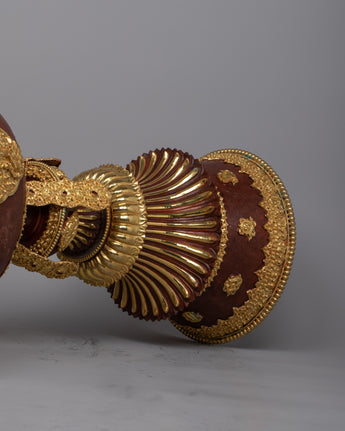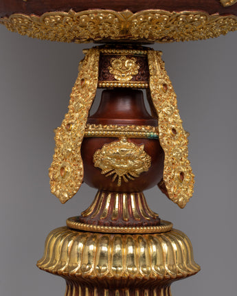 Our gorgeous Butter Lamp Set, which is expertly fashioned on copper bodies and lavishly plated in gold, will elevate your spiritual aura. With its 86cm height, this set is a magnificent focal point for any sacred space, radiating majesty and elegance. Every lamp is carefully crafted to give off a cozy, pleasant glow that represents the Buddhist tradition's illumination of compassion and wisdom.