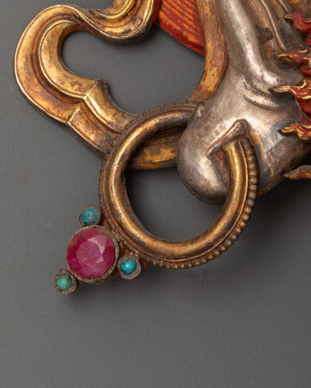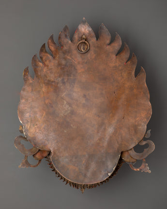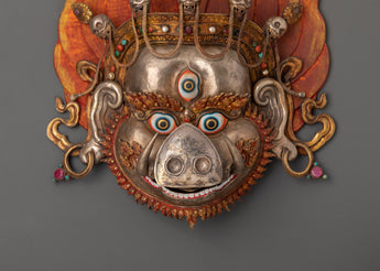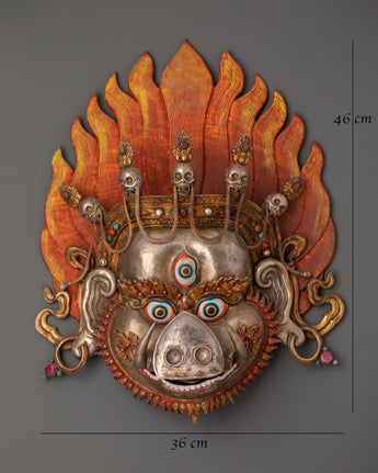 This Tibetan Copper Wall Mask is an influential and intriguing religious art, meticulously created with intricate detail and profound symbolism. This spectacular wall hanging mask, measuring 46cm in height and 36cm in width, is made of copper, plated with gold and pure silver, and hand-painted with brilliant acrylic colors. It exudes the vibrant energy of traditional Tibetan spiritual decor, embellished with coral and turquoise stones. The mask depicts a smiling face with an unsettling, almost mischievous smile, a prominent boar-like nose with tusks, and three wide-open eyes representing increased awareness and divine vision. This mask, framed by flame-like brows, a fiery beard, and wild flame-shaped hair, represents a powerful guardian energy common to Tibetan Buddhist protector deities.