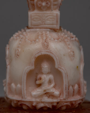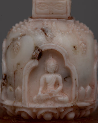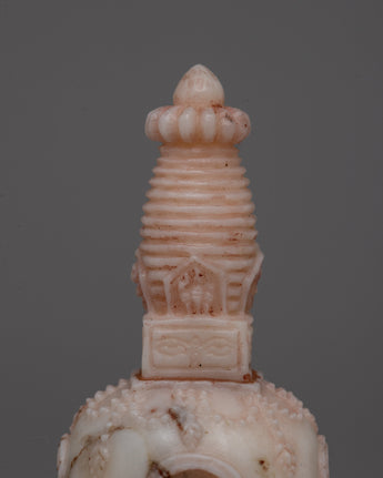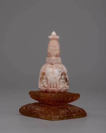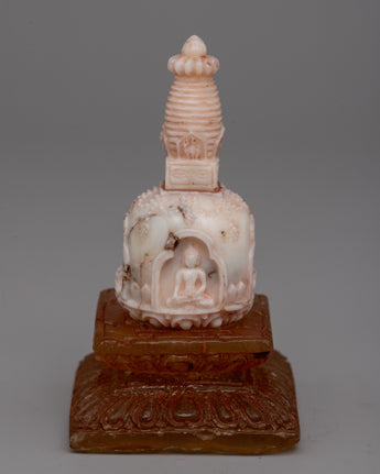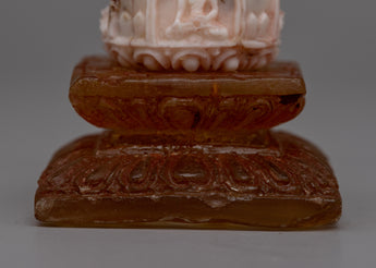 With its exquisite, handcrafted craftsmanship and rich meaning, our Handmade Tibetan Gemstone Buddhas Stupa will elevate your spiritual practice. With its 9.5 cm height, its upper portion carved from pure white Coral, and its lower part made from dazzling amber, this gorgeous stupa is a unique and significant addition to any sacred area.