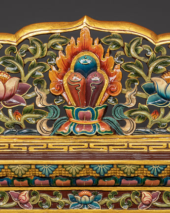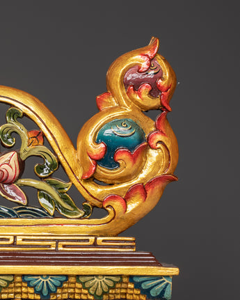 The drum is made of wood and painted in acrylic colors, ensuring performance and an eye-catching appearance. The intricate artwork surrounding the drum features a dragon, a symbol of strength, protection, and transformation, thereby enhancing the instrument's spiritual and medicinal properties. The wooden stick, which stands 61 cm tall, is designed for easy usage during spiritual practices such as meditation and Buddhist rites. The combination of wood and acrylic paint lends the drum a distinct visual appeal while enhancing harmonic attributes for richer sound resonance.