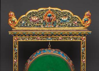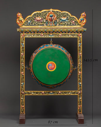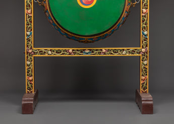 This Traditional Tibetan Drum is a beautiful and spiritual artifact, imbued with profound cultural importance. The drum, measuring 143.5 cm in height and 87 cm in width, is distinguished by a 54 cm diameter Dhangro, rendering it a remarkable enhancement to any spiritual environment. This drum, meticulously manufactured, showcases traditional Tibetan artistry, featuring a striking dragon motif portrayed in striking colors. This drum, utilized in ceremonial rites or as an elegant decorative item, symbolizes the profound cultural legacy of Tibet and imparts a sense of sanctity to your surroundings.
