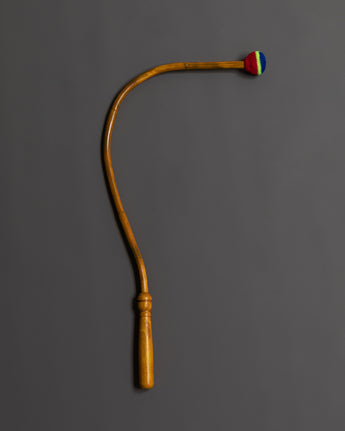 A Chod drum, integral to the Chod spiritual practice in Tibetan Buddhism, is a unique and symbolic instrument. Also known as a damaru, this small, double-sided hand drum features a narrow waist that connects two drumheads. The drum's shape is often likened to that of an hourglass, embodying the union of wisdom and compassion. Chod practitioners use the drum's rhythmic beating during ritualistic ceremonies to connect with the sacred energies, facilitating meditation and the realization of emptiness. With its ritualistic role, the Chod drum underscores the synthesis of sound, spirituality, and meditation in Tibetan Buddhist traditions.