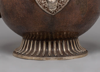 This Traditional Tibetan Tea Pot is a Himalayan handicraft masterpiece, with an oxidized copper body and delicate silver-plated decorations. This huge ceremonial teapot, measuring 55 cm in height and 54 cm in breadth and weighing 9.5 kg, is both a utilitarian vessel and a spiritual treasure of great significance. In Tibetan Buddhist culture, tea ceremonies represent hospitality, purification, and divine favors, making this handcrafted pot a prized object for holy rituals, altar displays, and Tibetan heritage collectors.