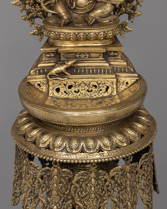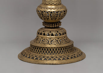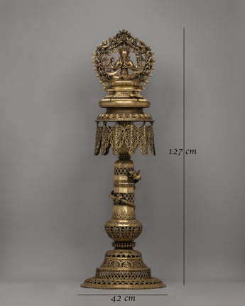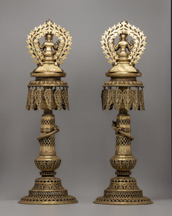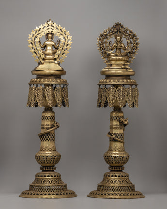 Presenting the magnificence of our typical Nepali oil lamp set, a remarkable work of cultural heritage made of high-quality brass with antique finishing. Each lamp is a remarkable 127 cm tall and 42 cm wide, weighing 18.210 kg each, for a total set weight of 36.41 kg. Nepalese rites and spiritual activities heavily rely on these age-old oil lamps, which are prized for their longevity and classic beauty. Intricate motifs adorn its sturdy brass body, which embodies Nepali craftsmanship's spiritual commitment and artistic mastery.