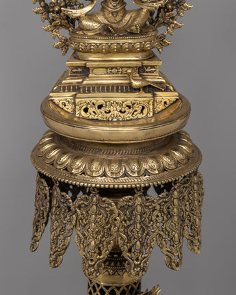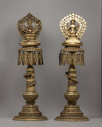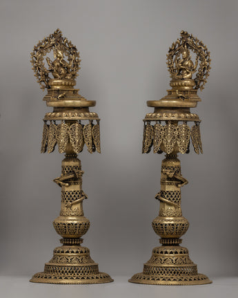 The stunning design of these lamps is a beautiful combination of Hindu and Buddhist spiritual meaning. One lamp features Lord Ganesh, the revered Hindu deity of wisdom, prosperity, and fresh beginnings. The other lamp commemorates the Four-Armed Avalokiteshvara, a compassionate Buddhist deity who represents kindness and enlightenment. These celestial images raise the lamps' significance, transforming them into not merely beautiful decor items but also deeply meaningful religious relics.