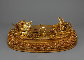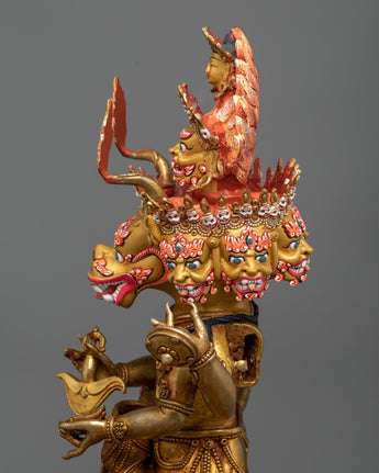 Introducing the Vajrabhairava Sculpture, a potent representation of one of Tibetan Buddhism's most dynamic and multifaceted deities, Vajrabhairava is revered for his role in dispelling ignorance and conquering obstacles. With a fantastic height of 22.8 inches and a base of 19.2 inches, this sculpture, which weighs 25.19 kg, perfectly captures the imposing and aggressive demeanor of Vajrabhairava. Made of a copper body with 24K gold plating, intricate gold, and acrylic paints accentuate it, signifying the deity's powerful transformational energy.