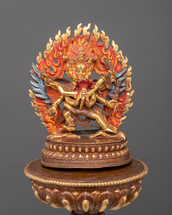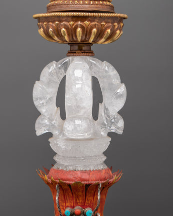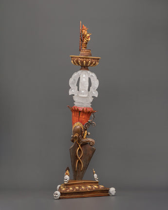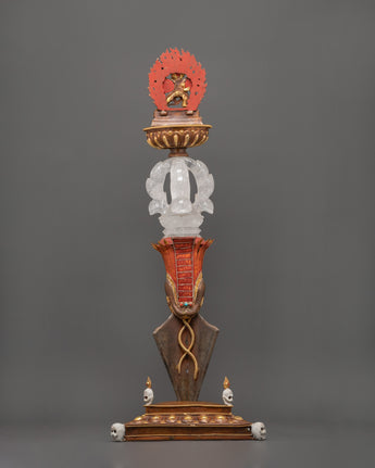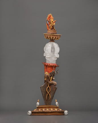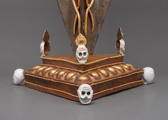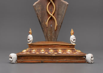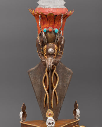 The Vajrakilaya Phurba is considered in Tibetan Buddhism a symbol of spiritual protection and a weapon for overcoming obstacles and negative energies. The triple-bladed phurba embodies the transformational force of Vajrakilaya, while the crystal centerpiece represents purity and clarity. Adorned with skull designs and delicate gold plating, the Vajrakilaya Phurba radiates heavenly power and protection, making it an ideal focal point for any ceremonial altar, temple, or spiritual space.