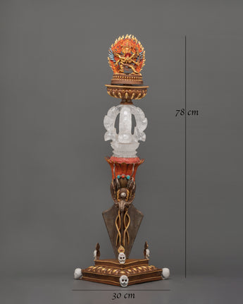 This Vajrakilaya Tibetan Phurba is a powerful ritual item skillfully crafted to embody the spiritual strength and transformation of the Vajrakilaya deity. This ceremonial dagger measures 78 cm in height, 30 cm in breadth, and weighs 6.732 kg. It is made of copper with gold-plated accents, pure silver, and a large crystal core. The meticulous craftsmanship and symbolic elements involved in its creation make it a distinctive piece for both spiritual practices and artistic collections.