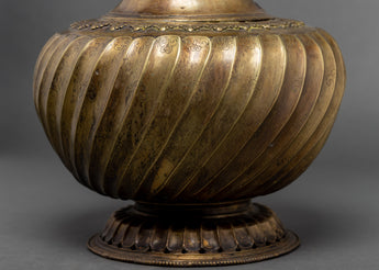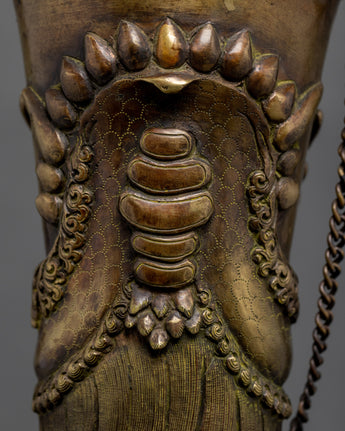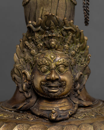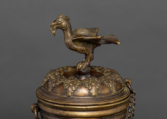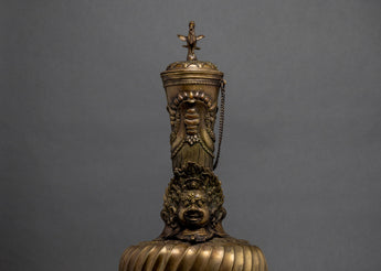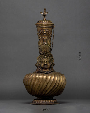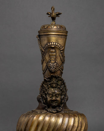 This fine bronze flask set for holding water has a flattened, bulbous body that sits on a flared Lotus base. The garuda is carved and placed at the top of the water flask. The neck is long, thin, and of baluster form. At the end of a long neck, the Bhairab has been carved. The cast brass stopper is similarly decorated, with gadrooning and petal-like relief. The final is pierced, and the chain has connected the stopper to the neck.