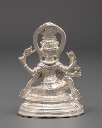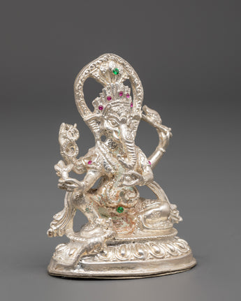 This Ganesh Statue with Ganesha Mudra is a stunning handcrafted work of spiritual art made of 98% silver. Standing 7.5 cm tall and 5.5 cm wide, this statue powerfully portrays the Hindu God of Prosperity and Wisdom, ideal for boosting your spiritual altar decor or meditation area. Ganesh is represented holding his trunk and hands in Ganesha Mudra, which means blessings, protection, and the elimination of obstacles. He carries an axe, mala beads, and a tusk, each representing the destruction of evil forces, spiritual practice, and the power to conquer obstacles. The lotus image represents purity, enlightenment, and the sacred force of a new beginning. Ganesh also wears a crown exquisitely etched with gemstones, which enhances the statue's divine aura.