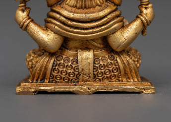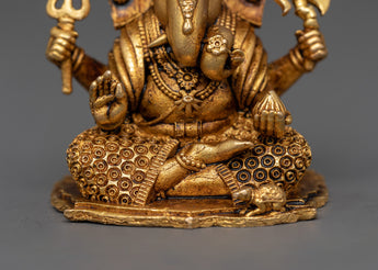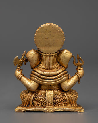 This handcrafted Ganesh with halo Statue depicts Lord Ganesha sitting, with elaborate symbolism in each of his four arms. This little brass idol, which measures 6 cm in height and 4.5 cm in breadth and weighs only 0.10 kg, is ideal for home altars, desks, or spiritual gifts. Ganesha's right front hand forms the Vitarka mudra, which represents the transfer of wisdom and guidance, and his left front hand holds a modak (sweet), which represents the rewards of a disciplined spiritual lifestyle.