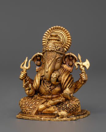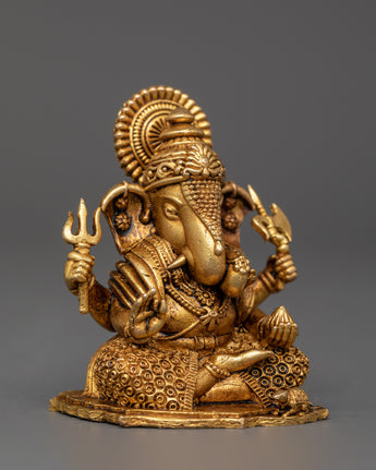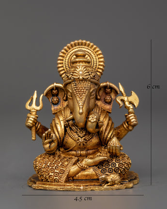 His upper right hand holds a trident, indicating heavenly strength and protection, while his upper left hand carries an axe, symbolizing the removal of attachments and ignorance. This little yet strong figure represents Lord Ganesha's functions as the remover of barriers, protector of wisdom, and bestower of success. The brass workmanship includes decorated robes, a serene facial expression, and his vehicle mouse companion at the base.