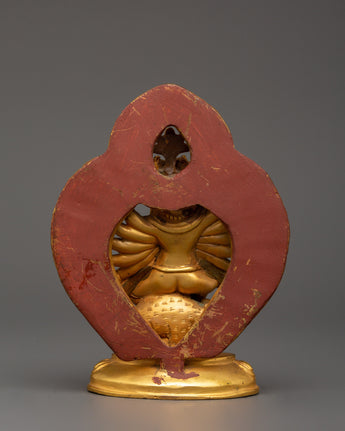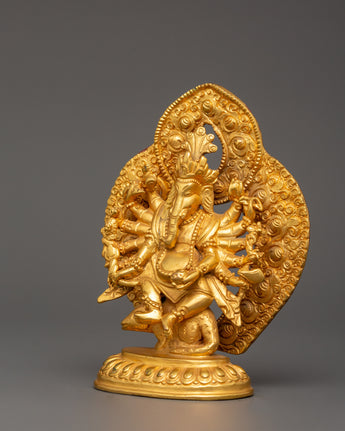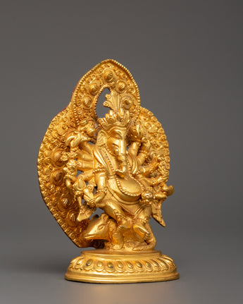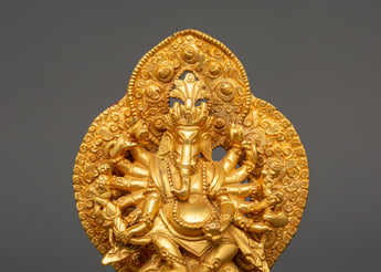 This handcrafted gold-plated Ganesh statue stands 12.5cm tall and is a revered emblem of wisdom, prosperity, and removing barriers. Lord Ganesha is adored in Hinduism as the deity of new beginnings, success, and spiritual instruction. Placing this statue in your house, shrine, or meditation room is thought to draw positive energy, eliminate obstacles, and bring prosperity.