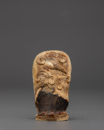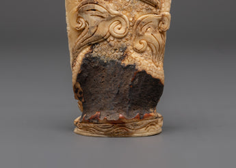 The statue depicts Ganesha in great detail, seated with symbolic gestures and sacred artifacts representing knowledge, direction, and divine power. The beautiful designs carved on the front and back add to its spiritual presence, indicating protection, abundance, and auspicious benefits. Each curve and intricacy exemplifies the beauty of Himalayan bone carving techniques, which hold cultural and devotional significance.
