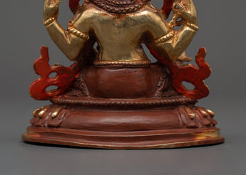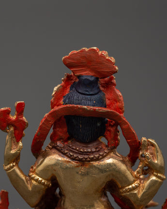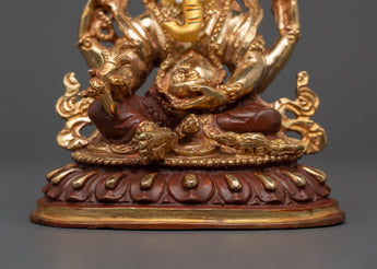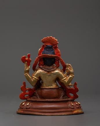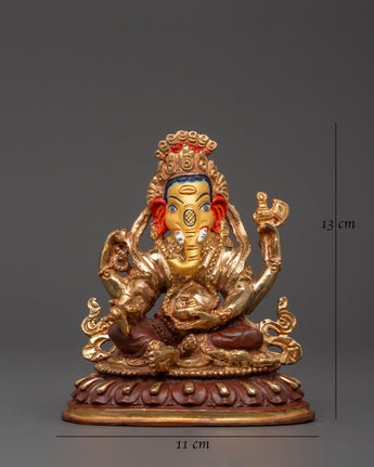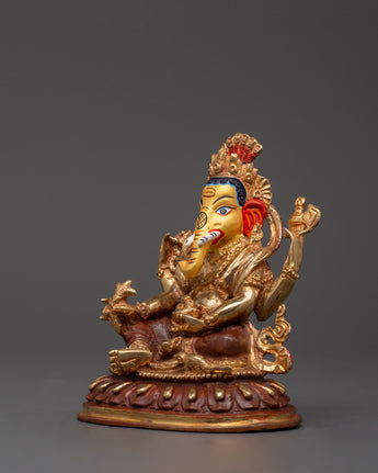 This handcrafted oxidized copper Ganesh statue is an excellent portrayal of Lord Ganesha, the remover of barriers and bringer of prosperity. This finely carved Lord Ganesha sculpture, which is 13cm tall and 11cm wide, is wonderfully painted with vibrant acrylic colors that bring its detailed features to life. The statue depicts Lord Ganesha seated on a lotus, clutching a conch and an axe, representing power, protection, and wisdom. The oxidized copper foundation complements the classic style, bringing elegance and spiritual energy to your home altar or temple.