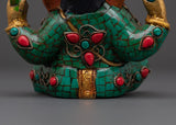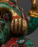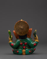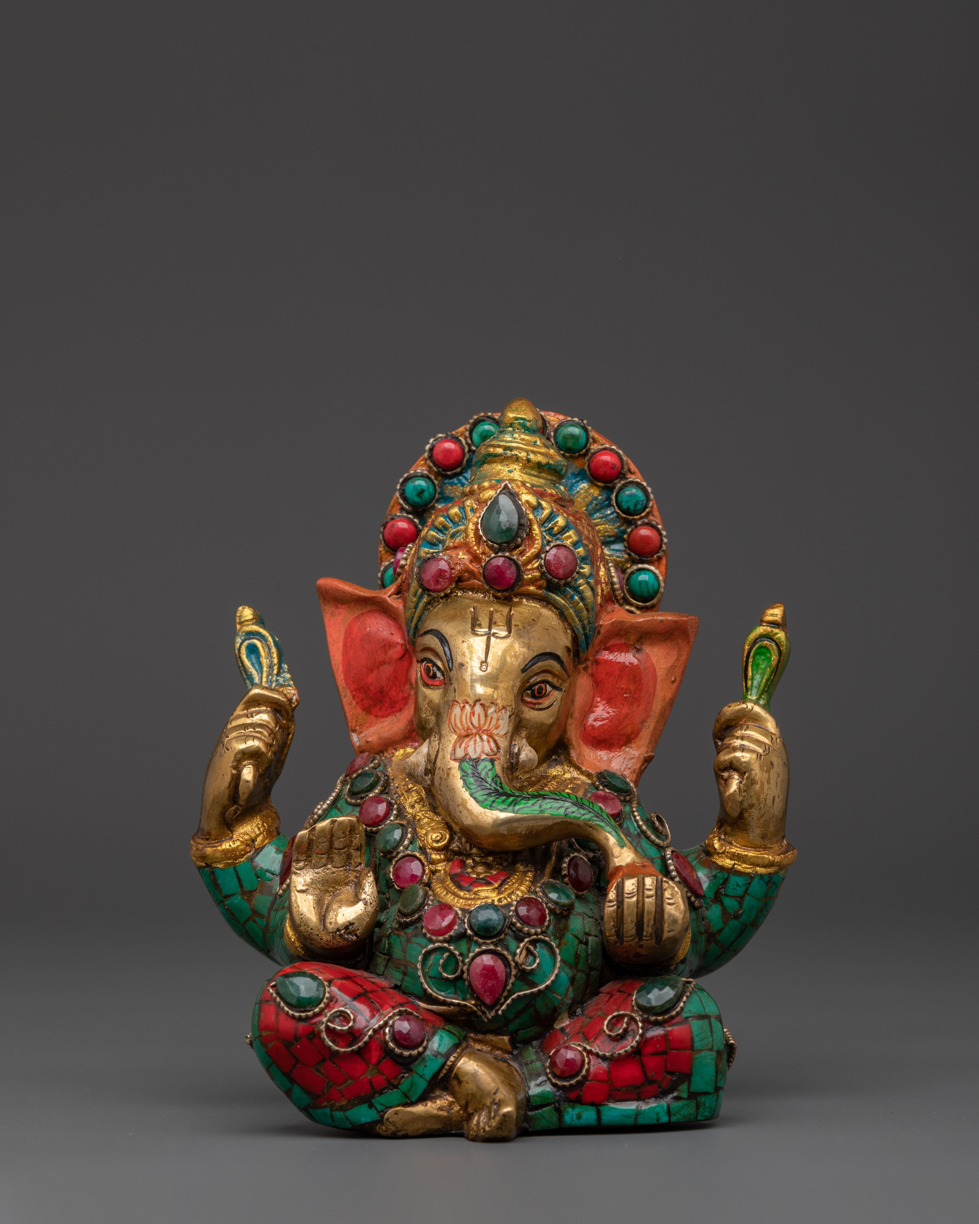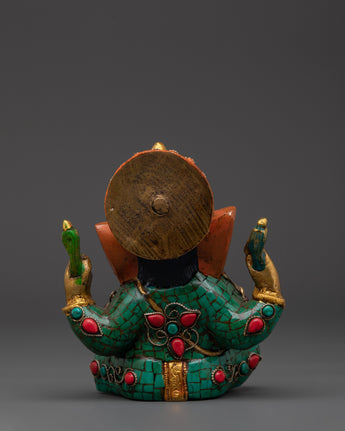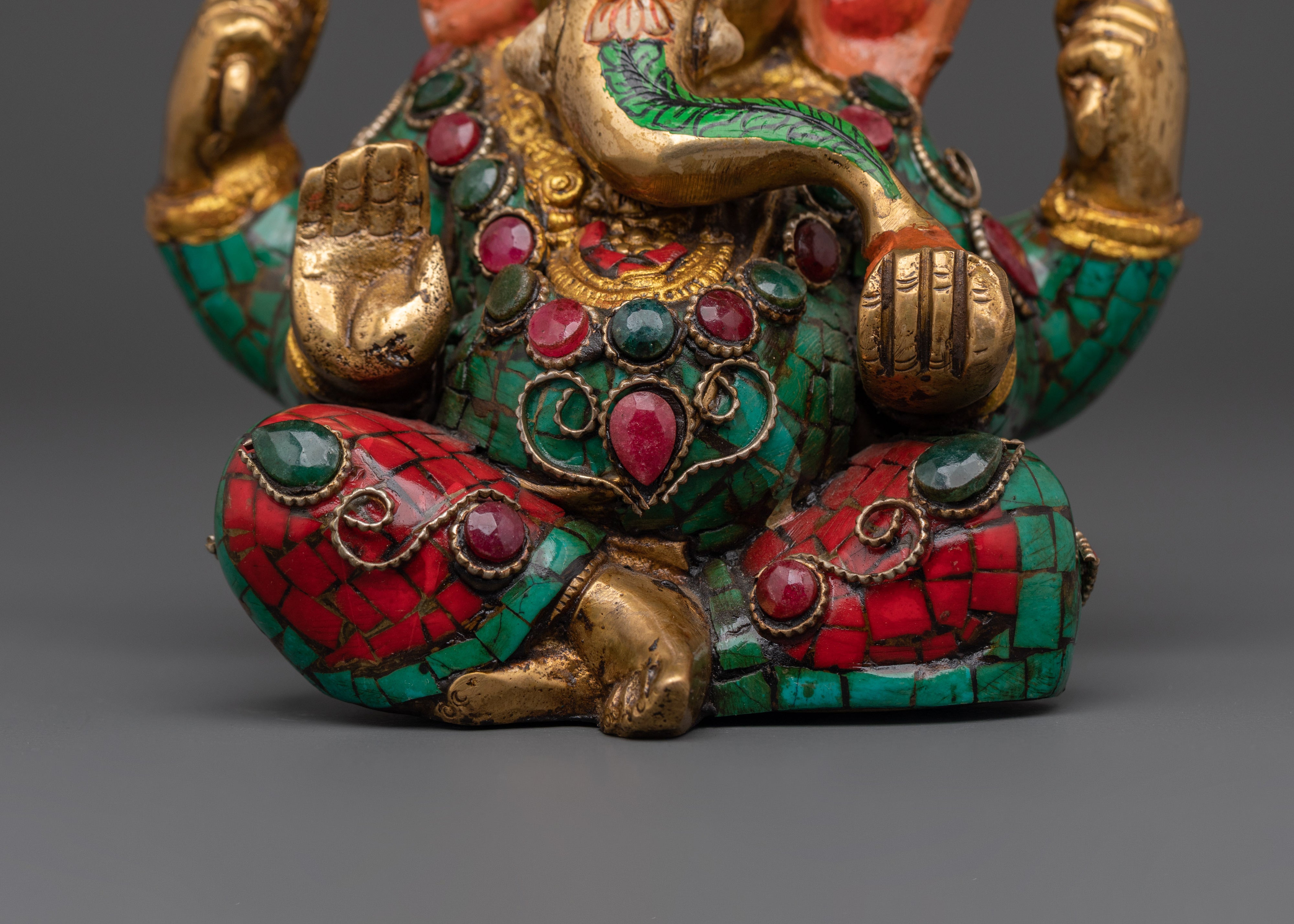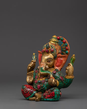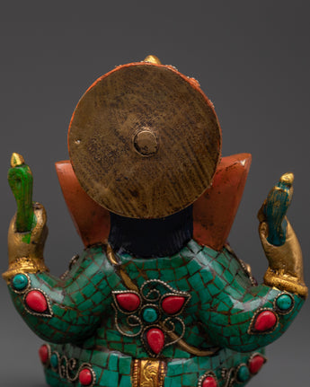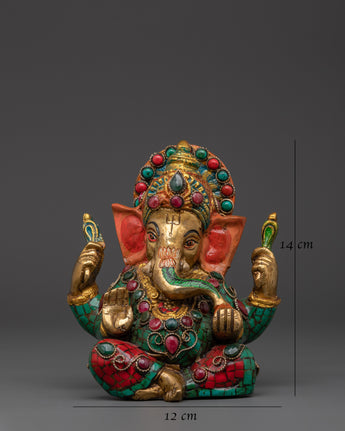 This Handmade Hindu Wisdom Deity Ganesh Statue is an exquisite depiction of Lord Ganesha, the famed remover of obstacles and god of intellect and prosperity. Standing 14cm tall, 12cm broad, and weighing 1.41kg, this brass sculpture exemplifies exquisite craftsmanship and spiritual meaning. The artisan's meticulous work portrays the deity's benevolent expression, with each feature beautifully carved to reflect Ganesha's caring and wise personality. The combination of brass and delicate coral and turquoise inlays lends this statue a bright, spiritual beauty, making it an excellent centerpiece for any home shrine or meditation space.