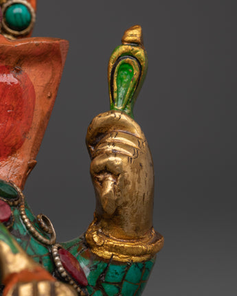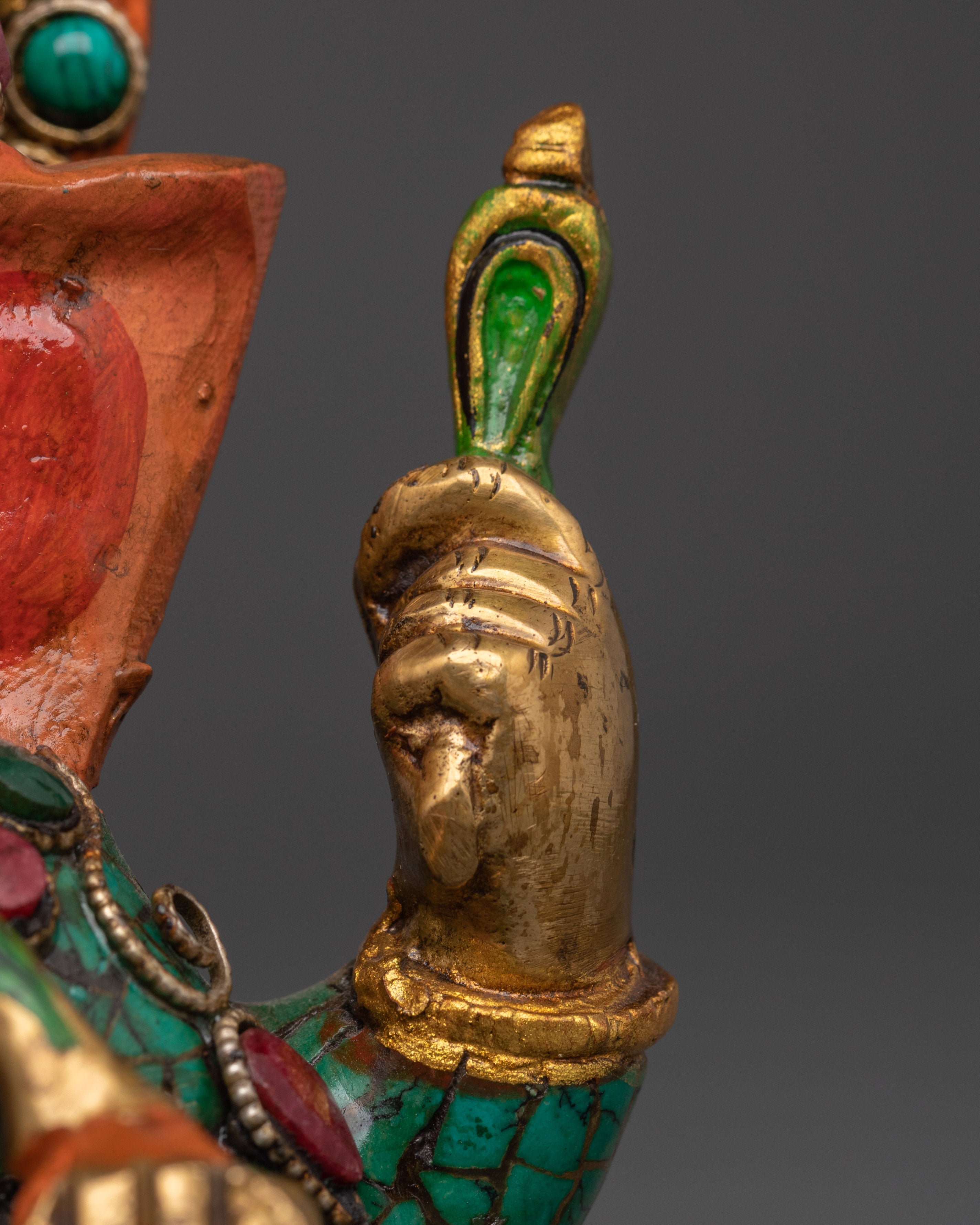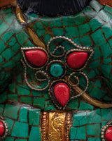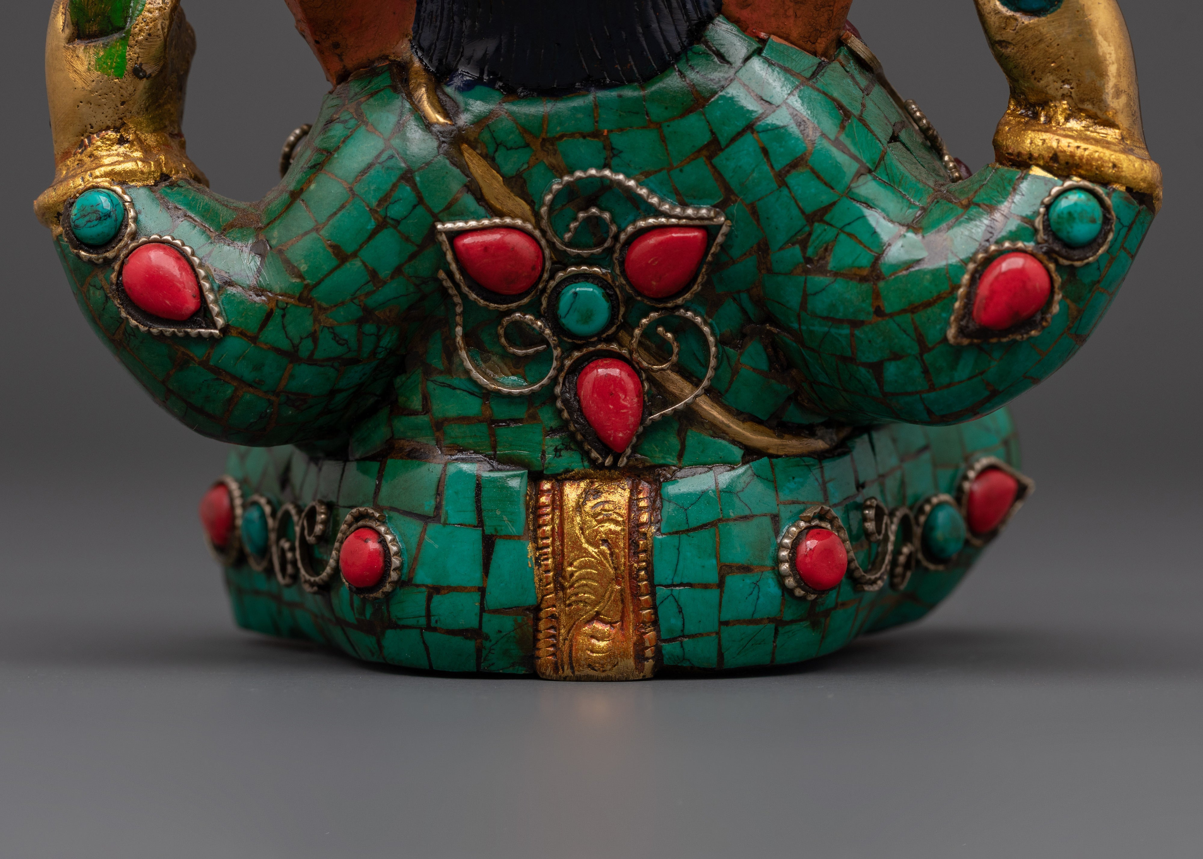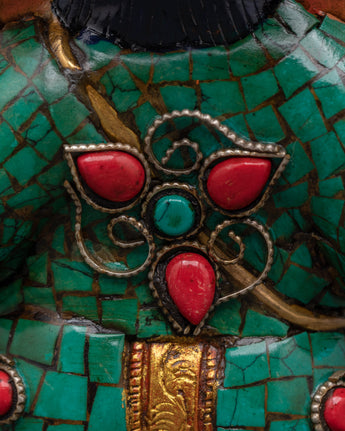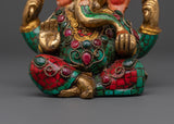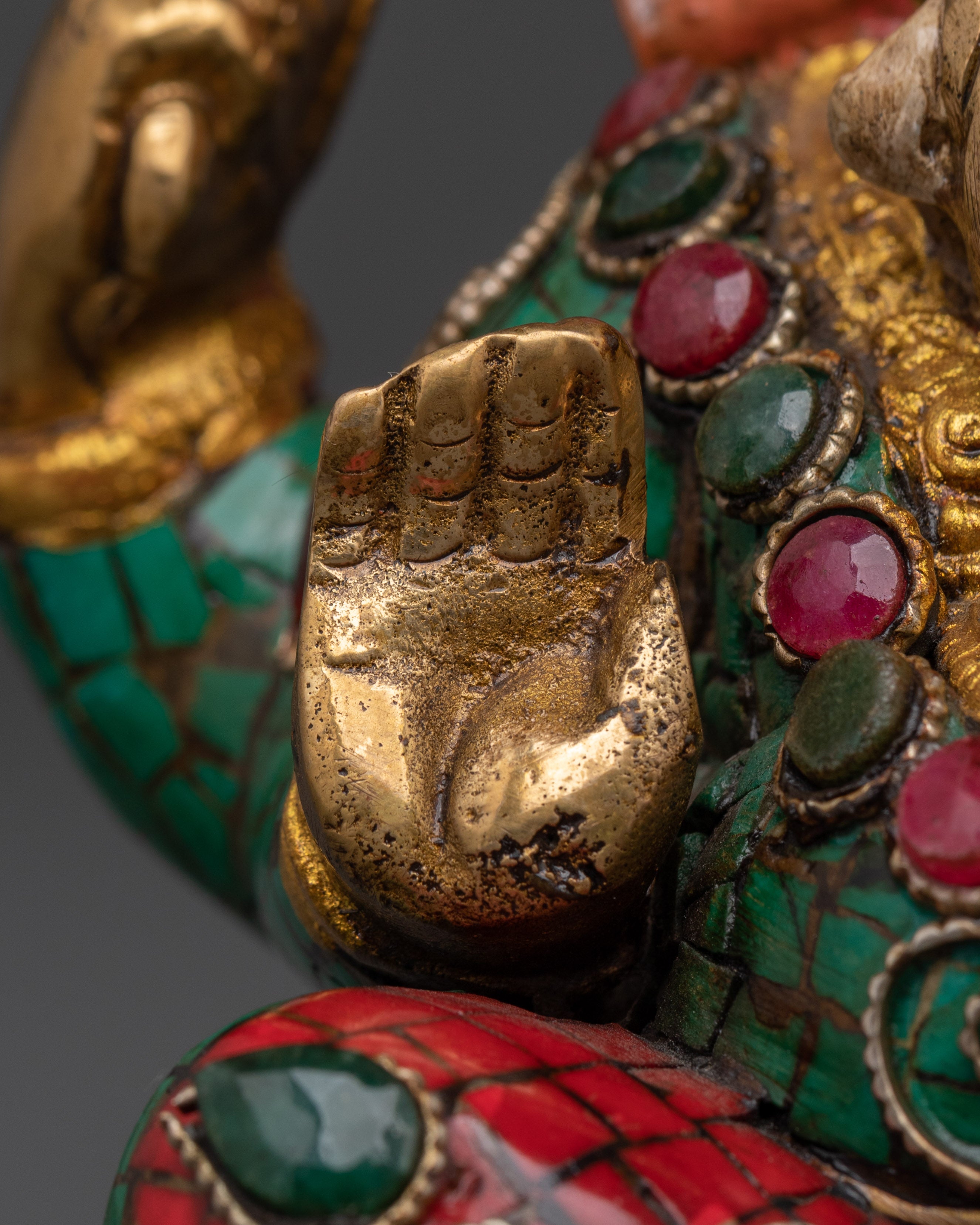The colorful coral and turquoise stones represent protection and tranquillity, while the golden brass body emits a warm, sacred glow that elevates the spiritual aura of any space. The deity is depicted in a classic seated pose, holding symbols of wisdom, strength, and enlightenment. The base has beautiful carvings inspired by old Indian temple art, demonstrating years of devotion and craftsmanship.