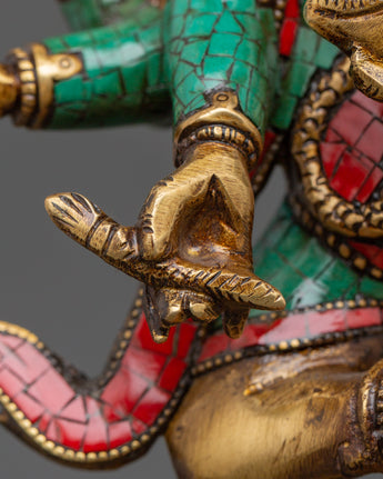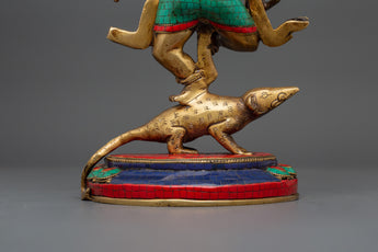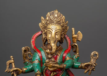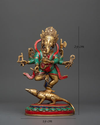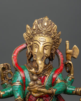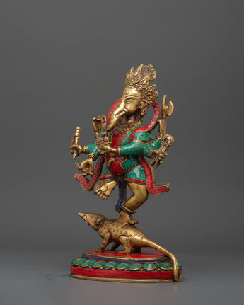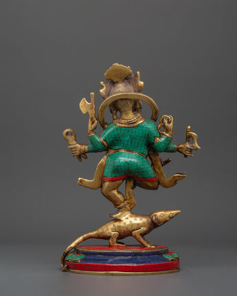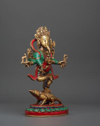 Lord Ganesh In Dance Posture Statue | Brass Ganesh Statue with Turquoise & Coral