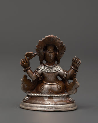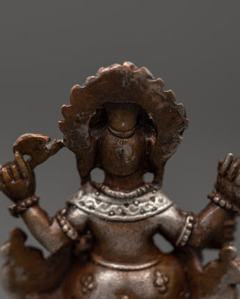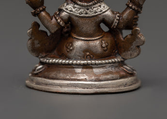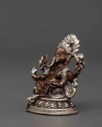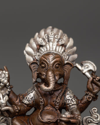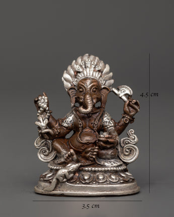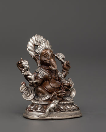 This Handcrafted Silver-Plated Lord Ganesha Hindu Elephant Deity Statue depicts Lord Ganesha, the Hindu god of knowledge, prosperity, and protection. This little idol, measuring 4.5 cm in height by 3.5 cm in breadth and weighing 0.046 kg, is excellent for personal altars, travel shrines, puja ceremonies, or as a spiritual gift. The statue, crafted from oxidized copper with silver-plated details, has a sacred charm and divine brilliance.