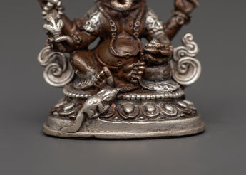 Ganesha is shown reclining on a lotus base with four symbolic arms carrying sacred artifacts such as a modak (sweet) for the benefits of spiritual devotion, a rope to guide believers ahead, and an axe to clear obstacles. His mouse companion lies at his feet, representing humility and control over desires. The contrasting silver accents on his crown, clothing, and accessories create elegance while emphasizing his heavenly presence and sacred meaning. This statue attracts positive energy wherever it is placed, making it ideal for individuals embarking on new adventures or seeking spiritual clarity and protection.