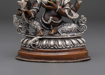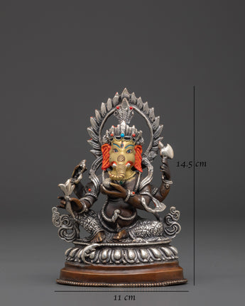 The Prosperity Deity Ganesh Statue is a sacred symbol of abundance, wisdom, and spiritual harmony. Measuring 14.5cm in height and 11cm in width, and weighing 0.68kg, this divine creation is crafted from copper with an elegant silver-plated finish. In Hindu tradition, Lord Ganesha is the remover of obstacles and the harbinger of good fortune, making this statue an auspicious addition to puja rooms, home temples, and meditation spaces.