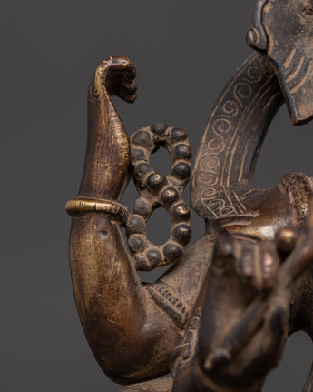 This Sacred Ganesh Sculpture is a magnificent work of art, delicately carved from oxidized brass. Standing 28.5cm tall and weighing 5.79kg, this sculpture represents Lord Ganesha, a revered Hindu god known for removing barriers and bringing in wealth. The statue depicts Ganesha seated gracefully, his face serene and wise. His various arms hold symbolic goods such as a sweet (modak) representing the fruits of devotion, a lotus flower for spiritual purity, and a conch shell, which represents victory and the holy music of creation.