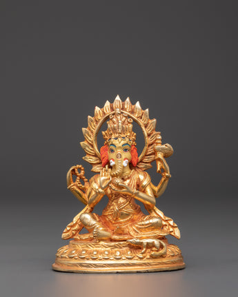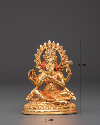 The Shree Lord Ganesh Statue is a revered symbol of prosperity, wisdom, and divine blessings, designed to bring positivity and harmony into any space. Measuring 11cm in height and 9cm in width, and weighing 0.35kg, this exquisite statue is expertly crafted from copper and finished with a stunning layer of gold plating that highlights every intricate detail. In Hindu tradition, Lord Ganesha holds the revered role as the remover of obstacles, the bearer of success, and the deity of intellect and fresh beginnings. This beautifully detailed statue captures his divine posture and symbolic attributes with precision, allowing it to radiate energy and blessings throughout your home, office, or sacred space.