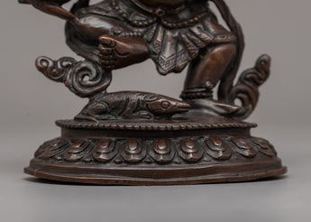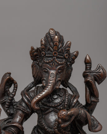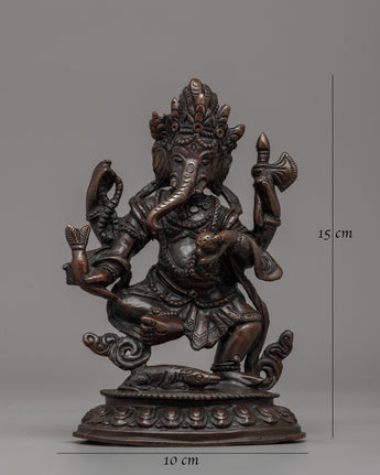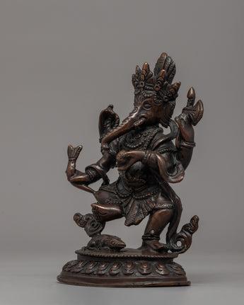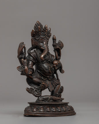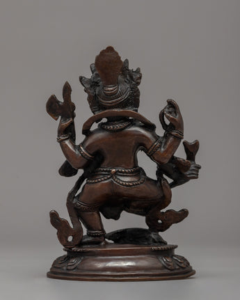 This Standing Ganesha Statue, 15cm tall and 10cm wide with a weight of 0.80kg, is elegantly created from oxidized copper, giving it a timeless and antique look. Ganesha is regarded in Tibetan Buddhism as a defender of prosperity and remover of barriers, and he plays an important role in spiritual and financial success. Vinayaka, also known as the Directional Protector, ensures that the path to enlightenment is clear of obstacles. Ganesha's involvement in Buddhist traditions is immensely symbolic, as Avalokiteshvara convinced him to become a Dharma Protector, guiding practitioners on their spiritual journey.